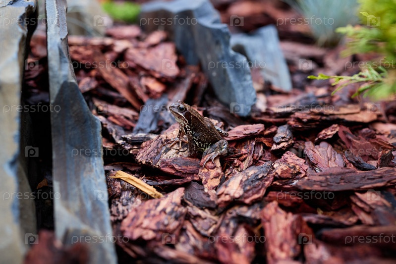 Изображение крупным планом лягушки, замаскированной среди мульчи и камней на местности
