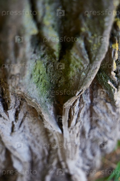 Это изображение крупным планом, на котором изображена сложная текстура коры дерева и лишайниковые ростки