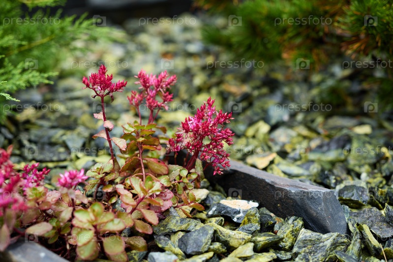 Яркие и красочные суккулентные растения, расположенные среди гальки в естественно красивом саду