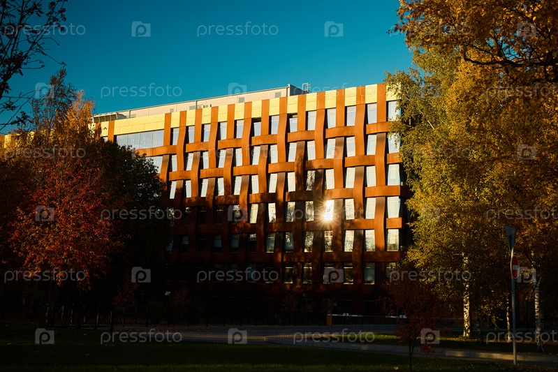 Потрясающее современное здание, расположенное среди яркой осенней листвы под ясным голубым небом