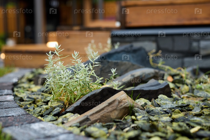 Расположение природных камней и растений в современном ландшафтном дизайне создает гармонию