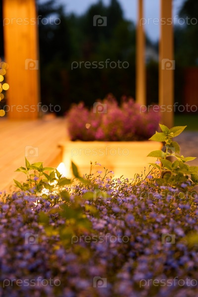 Спокойный и красивый вечерний сад с яркими фиолетовыми цветами и мягким освещением