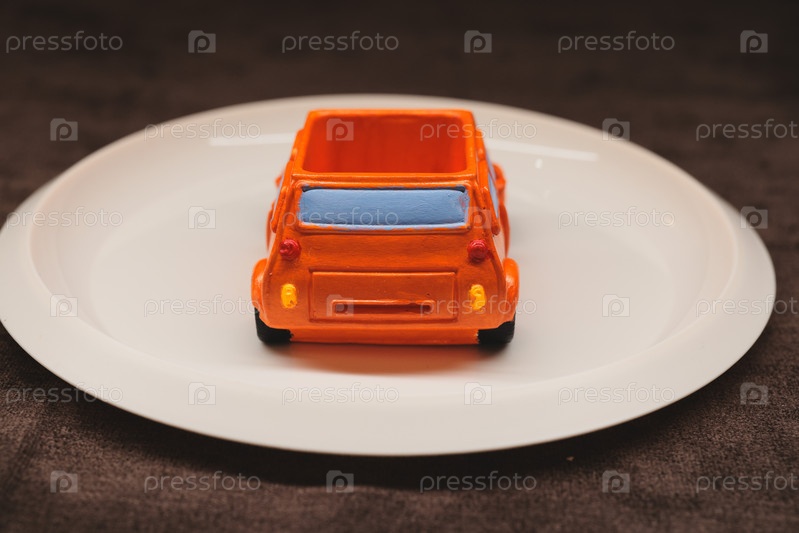 Красочная игрушечная машинка на тарелке. Привлекательная и креативная концепция, демонстрирующая игривость