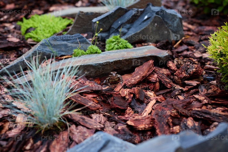 Красивый и умиротворяющий сад камней, украшенный пышной зеленью и древесной мульчей для спокойного уединения