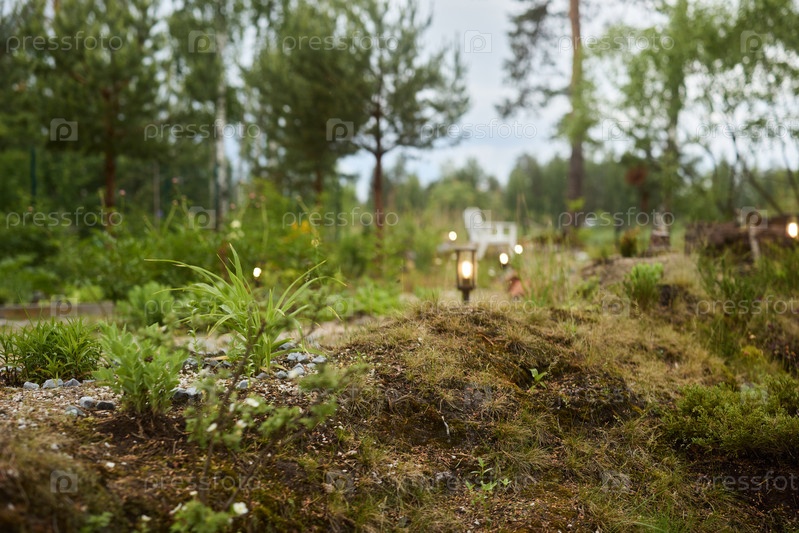 Тихий сад с красивыми сосульками, висящими среди пышной зелени,