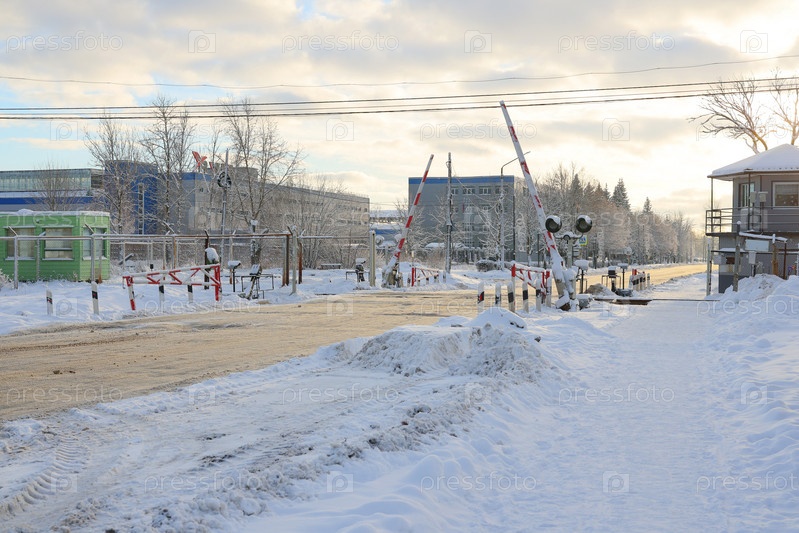 Снежная зимняя сцена на железнодорожном переезде с красивыми зданиями в спокойной обстановке