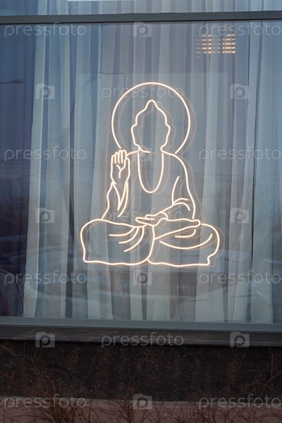 Красивое украшение из неоновых ламп в виде Будды элегантно и со вкусом выставлено в зоне окна