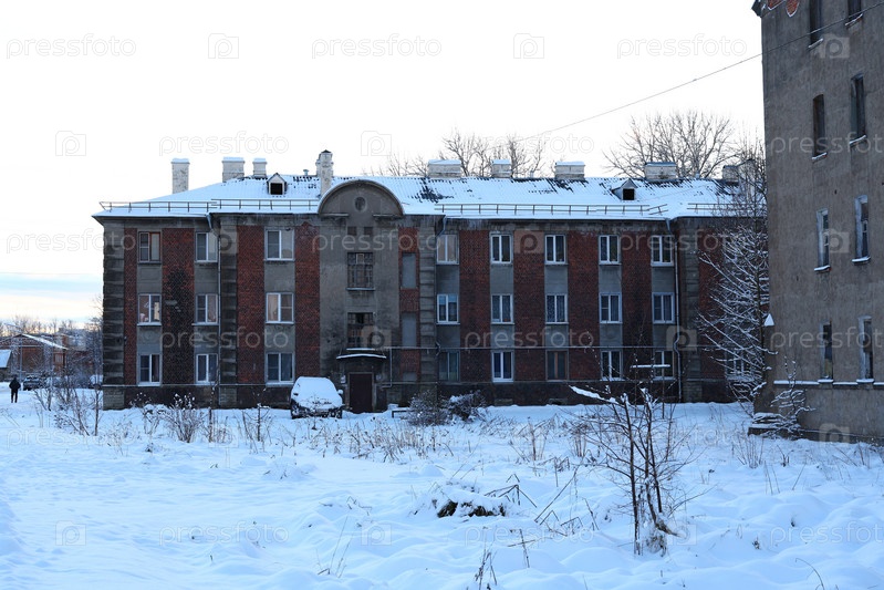 Потрясающее заснеженное заброшенное здание, расположенное на фоне прекрасного зимнего пейзажа