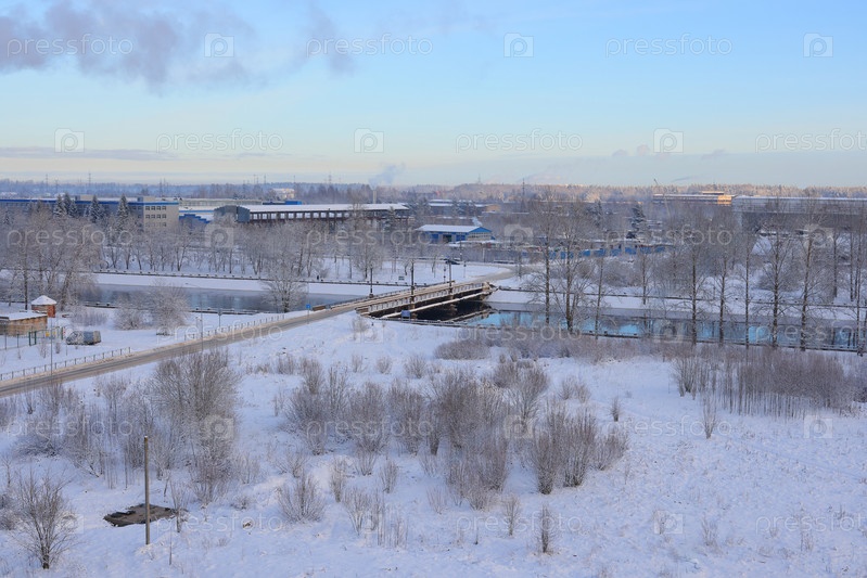 Потрясающе красивый зимний пейзаж с заснеженной рекой и очаровательным мостом