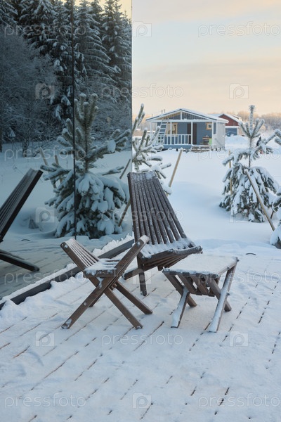 Уютный зимний отдых, расположенный в заснеженном ландшафте, окруженный красивой деревянной мебелью