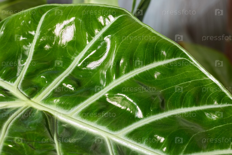 Крупным планом вид красивого глянцевого зеленого листа с замысловатыми и детализированными прожилками