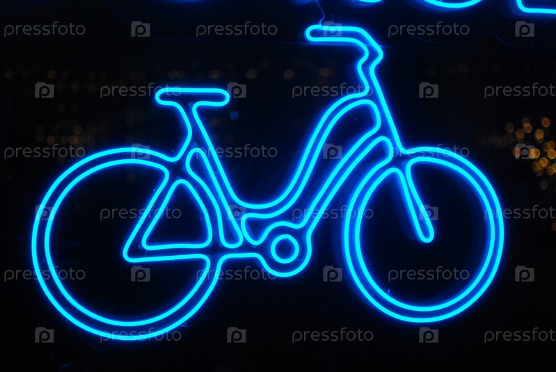 Художественная экспозиция с синим неоновым знаком велосипеда, которая привлекает внимание и создает атмосферу