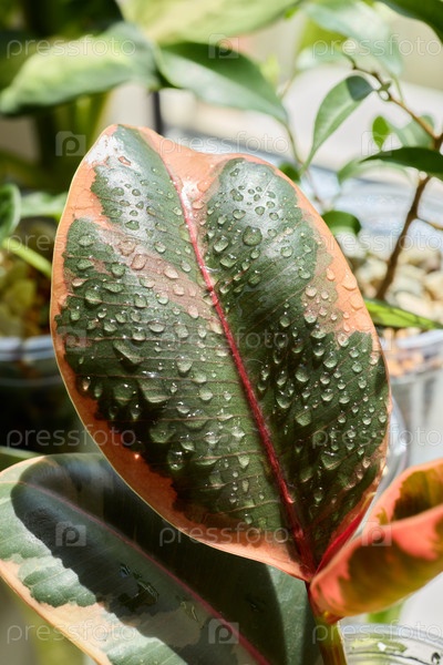Яркий лист, украшенный кристально чистыми каплями воды, запечатленный в ярком естественном свете