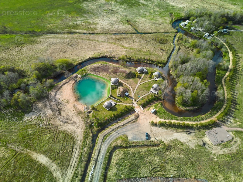 Вид с воздуха на прекрасный загородный курорт с целебным прудом и уютными домиками