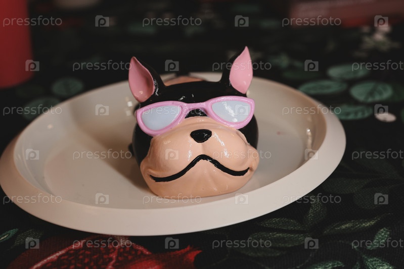 Очаровательная и милая фигурка собаки в солнцезащитных очках, выставленная на декоративной тарелке