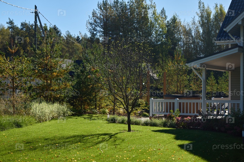 Тихий и живописный задний двор с сочной зеленой травой, яркими деревьями и красотой природы