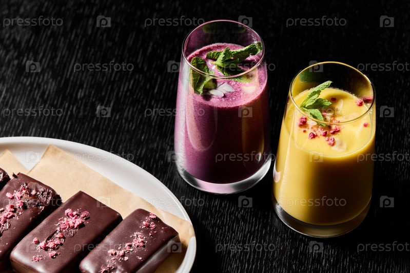 Яркие красочные смузи и соблазнительные шоколадные лакомства, красиво представленные на темном фоне