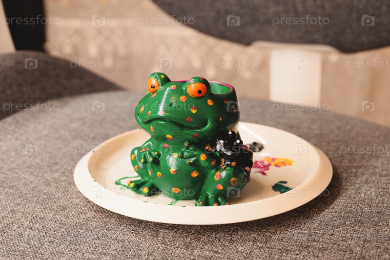 Яркая и красочная фигурка лягушки с брызгами краски на креативной пластине