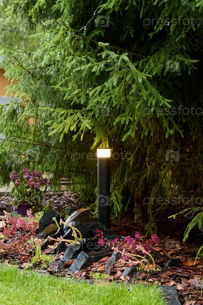 Ощутите потрясающую красоту уличного садового освещения, расположенного среди пышной зелени вокруг