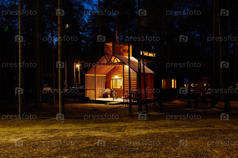 Уютный домик, красиво освещенный ночью, в тихом лесном уголке