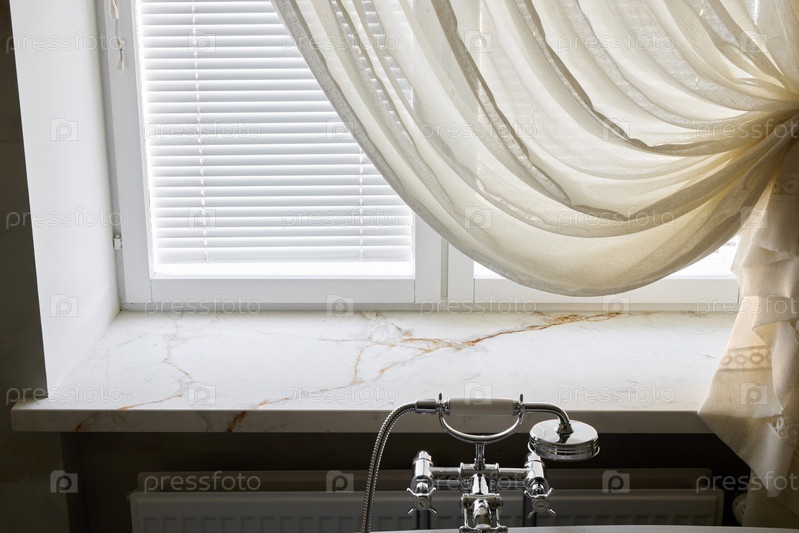 Элегантное окно с мягкими кремовыми шторами и стильным мраморным подоконником под ним