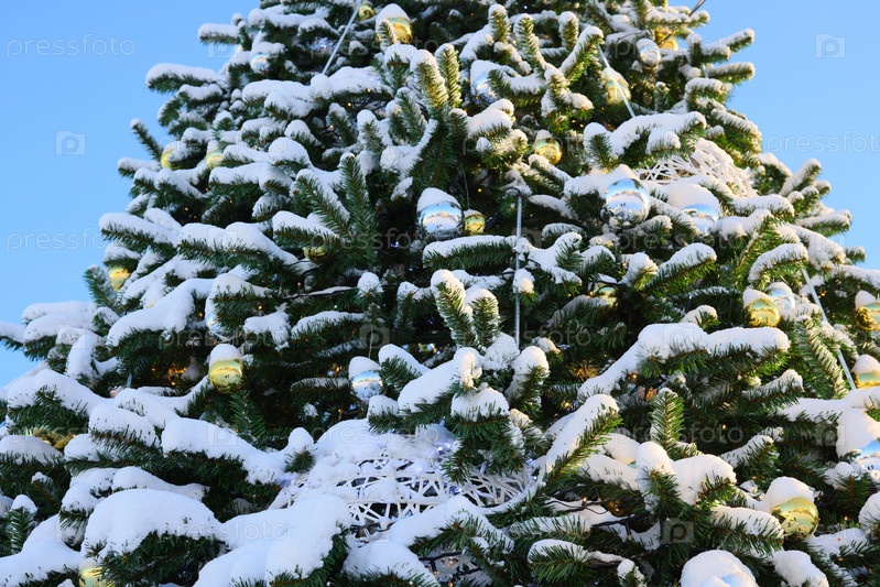 Красиво украшенная заснеженная рождественская елка, украшенная мерцающими золотыми игрушками