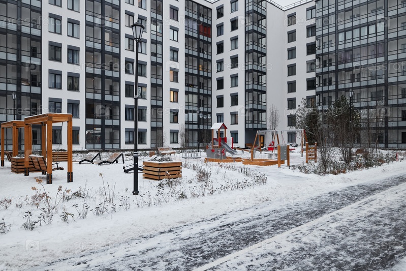 Почувствуйте зимнюю сказку в городской среде с игровой площадкой и прекрасным снегом