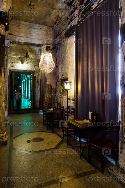Красивый и таинственный интерьер винтажного ресторана, дополненный атмосферой приглушенного освещения