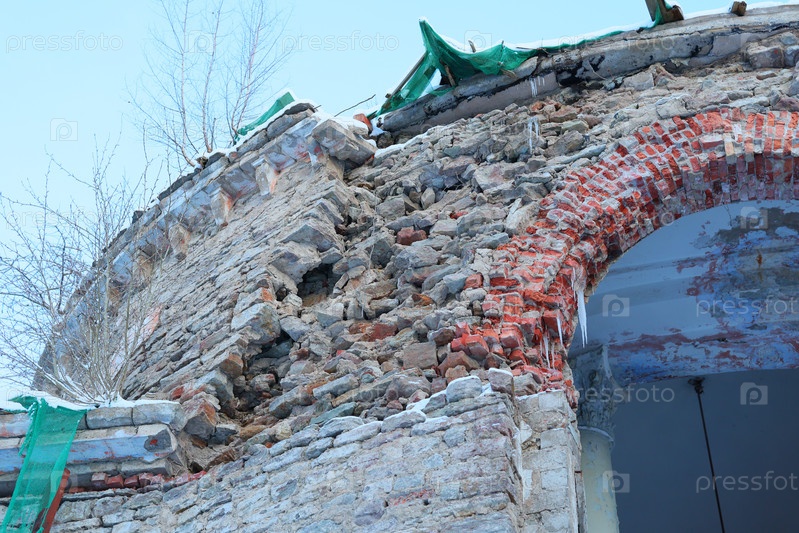Выветренная каменная стена с аркой и рядом различные материалы для ремонта