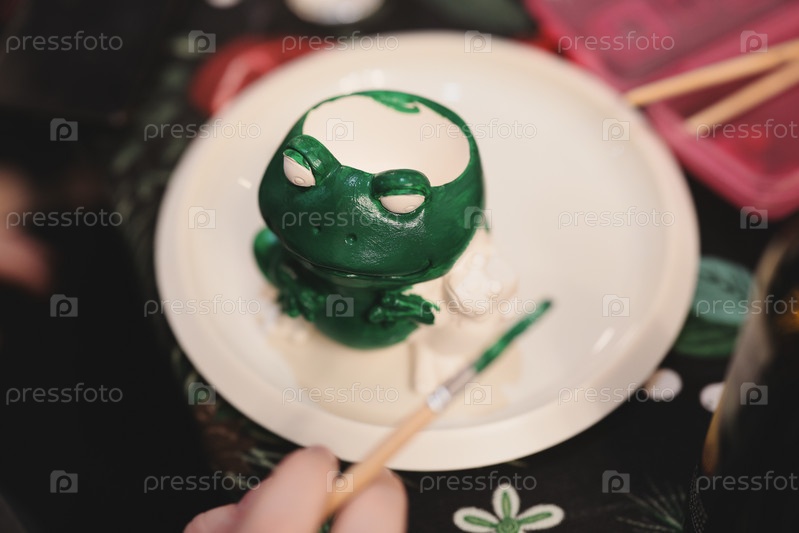 Креативная и красочная картина очаровательной фигурки зеленой лягушки в керамическом искусстве