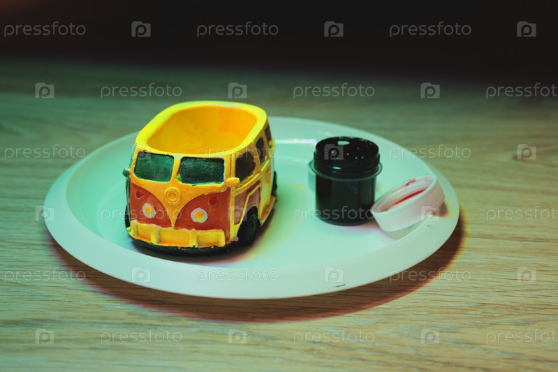 Красочный игрушечный фургон, художественно расположенный на тарелке, окруженный забавными аксессуарами