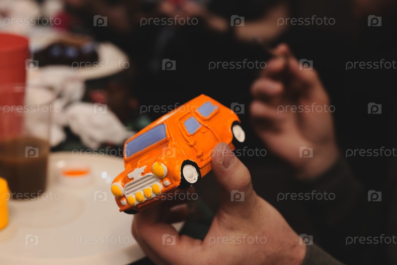 Человек с радостью держит в руках красочный игрушечный фургон, который приносит радость и идеально подходит для игр