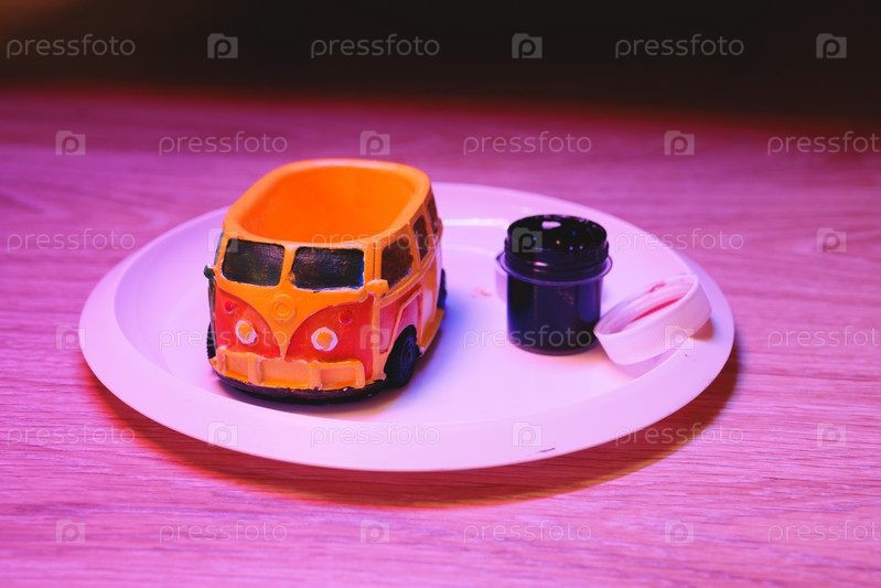 Красочный игрушечный фургон и его аксессуары, красиво выставленные на тарелке для всех желающих