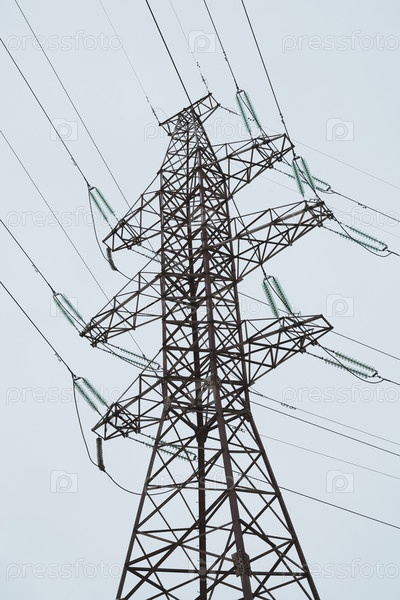 Высокая высоковольтная башня электропередачи выделяется на фоне облачного неба