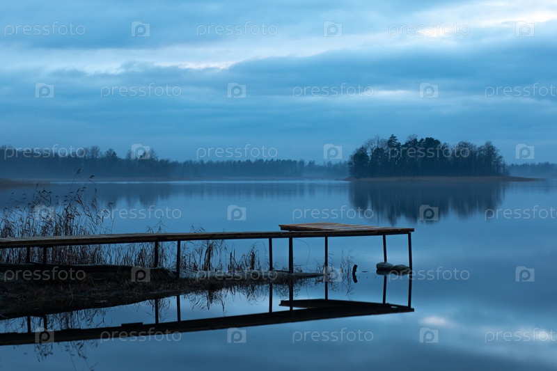 Мостки с отражением в воде и вид на озеро ранним утром. Ленинградская область