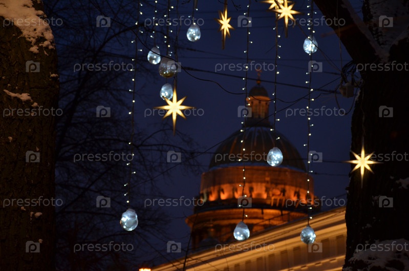 Купол Исаакиевского собора над зданием Центрального выставочного зала Манеж на фоне новогодних украшений Конногвардейского бульвара в Санкт-Петербурге