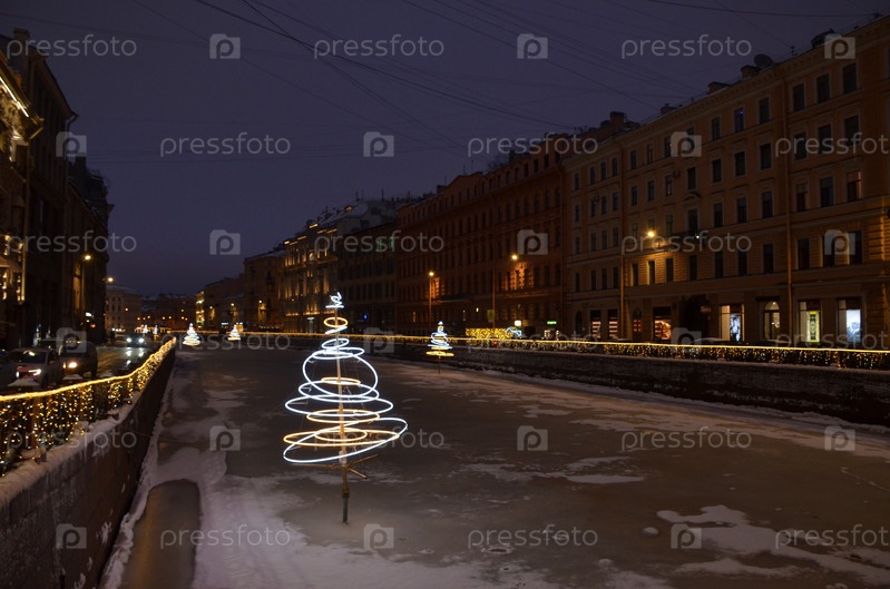 Светящиеся елочки и новогодние гирлянды на замерзшей реке Мойка в Санкт-Петербурге