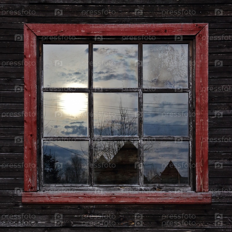 Квадратное окно старого деревянного деревенского дома в деревянной раме с отражениями крыш, неба и закатного солнца во фрагментах остекленения. Пейзаж в квадратах