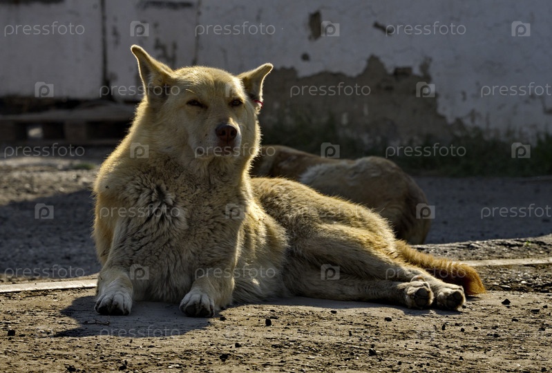 Россия, юг Западной Сибири. Собака неизвестной породы беззаботно отдыхает в лучах утреннего солнца