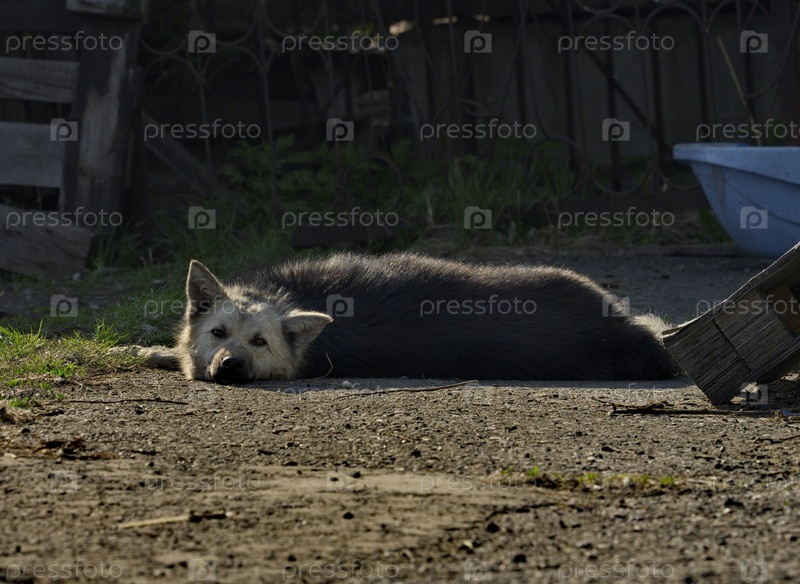 Россия, юг Западной Сибири. Собака неизвестной породы беззаботно отдыхает в лучах утреннего солнца
