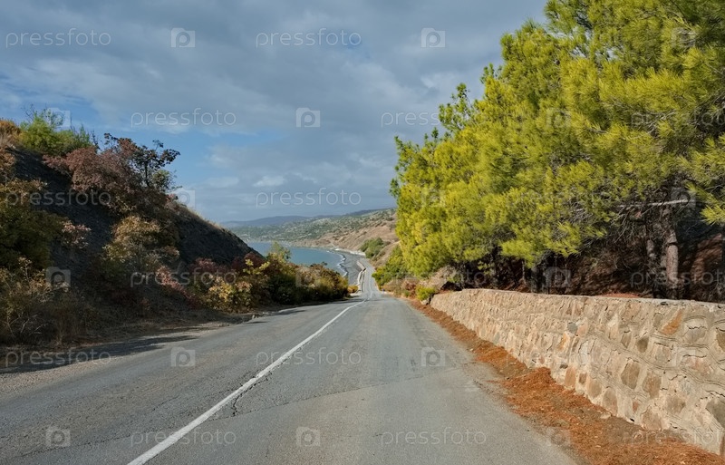 Россия, Республика Крым. Вид на извилистую асфальтированную дорогу вдоль берега Черного моря возле города Судак в окружении живописных гор