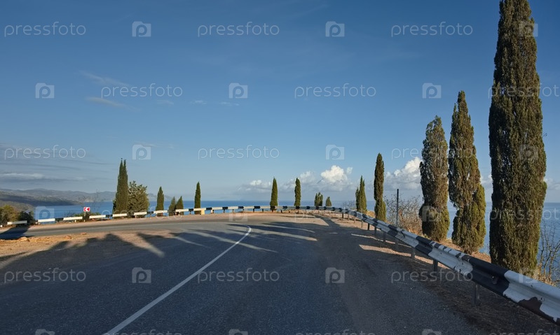 Россия, Республика Крым. Вид на извилистую асфальтированную дорогу вдоль берега Черного моря возле города Судак в окружении живописных гор