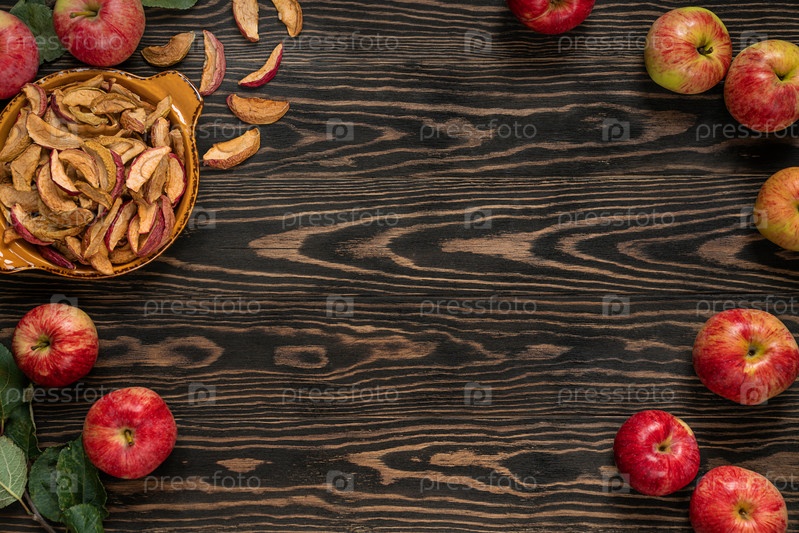 Вид сверху на фон с сухими яблочными дольками и свежим яблоком на темном деревянном фоне. Вид сверху на чипсы из запеченных сушеных яблок и свежие яблоки на деревянном фоне