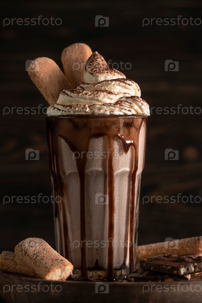 Шоколадный молочный коктейль с мороженым, печеньем «дамские пальчики» и какао. Мороженое в высоком стакане со взбитыми сливками