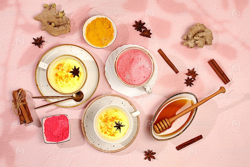 Разнообразие японских чаев латте из золотистой куркумы и розового лунного молока. Модный полезный напиток матча способствует снижению веса, расслабляет перед сном и обладает противовоспалительными свойствами