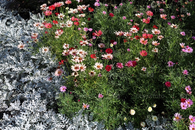 Клумба из цветов и растений с декоративными листьями (цинерария)