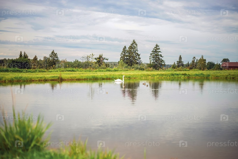 Пруд с семейством лебедей. Летний день над прудом. Красивая зеленая территория. Лебеди в озере