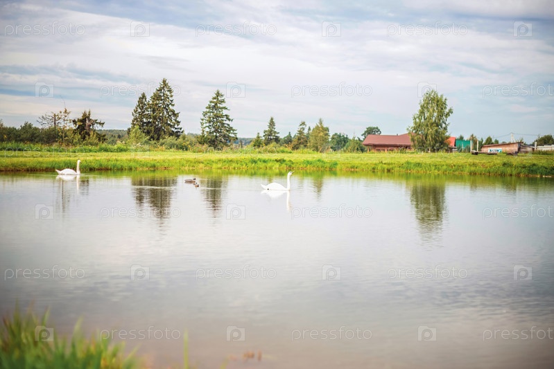 Пруд с семейством лебедей. Летний день над прудом. Красивая зеленая территория. Лебеди в озере