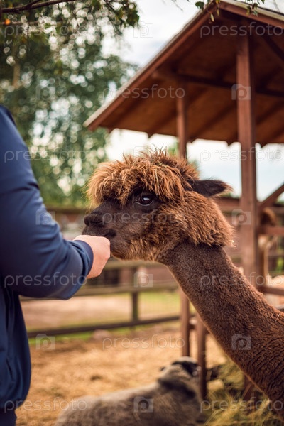 Мужчина кормит альпаку на ферме. Альпака в загоне