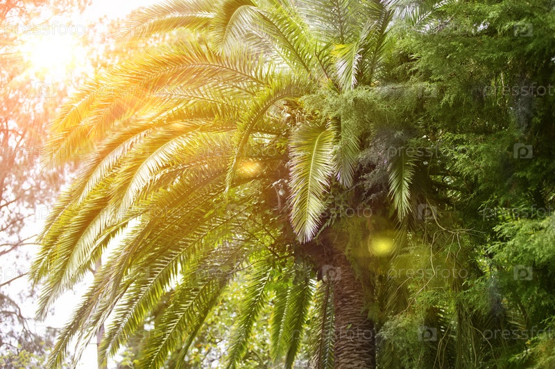 Листья тропической пальмы в солнечном свете. Экзотический растительный фон